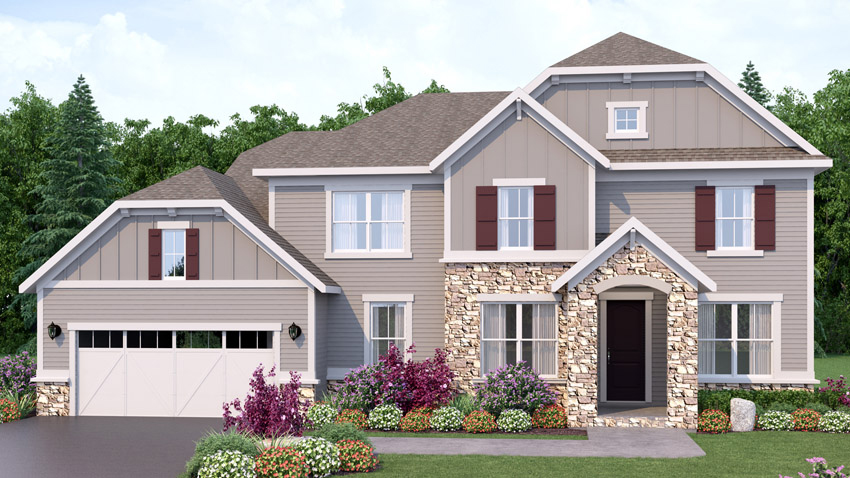 Exterior rendering of a 2-story home from the front, Bethpage floor plan. Northern Craftsman